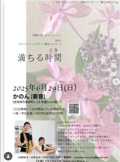 📅6/29(日)📌サクソフォンとピアノで綴るコンサート「満ちる時間」