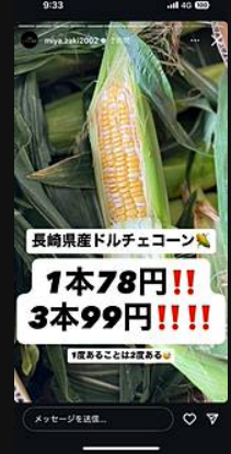 (ミヤザキさん仕入れすぎたらしいです笑今から行きまーす♪)トウモロコシ3本99円