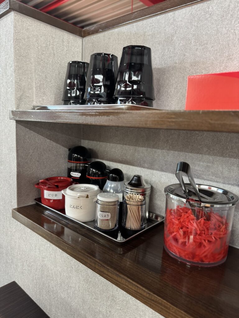 辛子高菜、紅しょうが、ゴマ、にんにく、替え玉もあり。