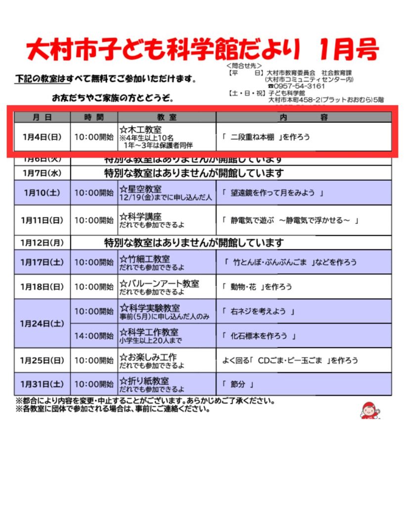📅1/4(日)📌木工教室「二段重ね本棚を作ろう」
