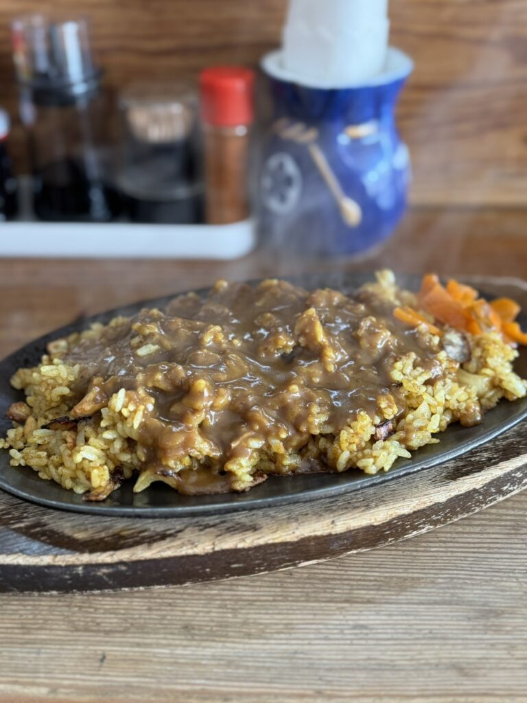 ドライカレーは鉄板で提供されて、おこげができるのもたまらなくて、