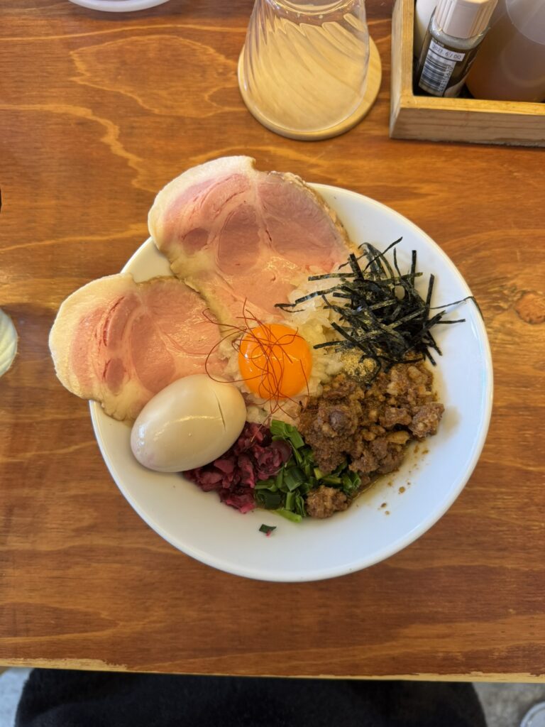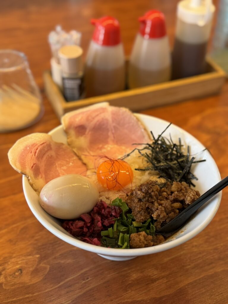 ・甘辛ミンチ、しば漬け、ニラ、玉ねぎ、卵黄などを混ぜて食べる構成