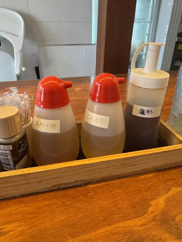 ・味変用にスパイ酢、こんぶ酢、塩ダレを用意
