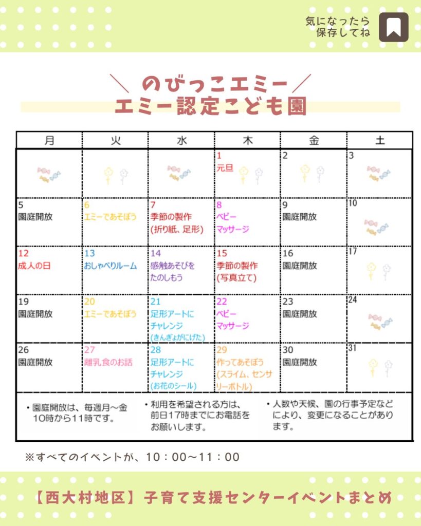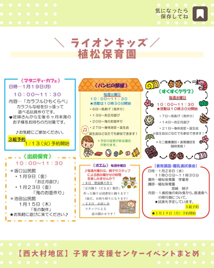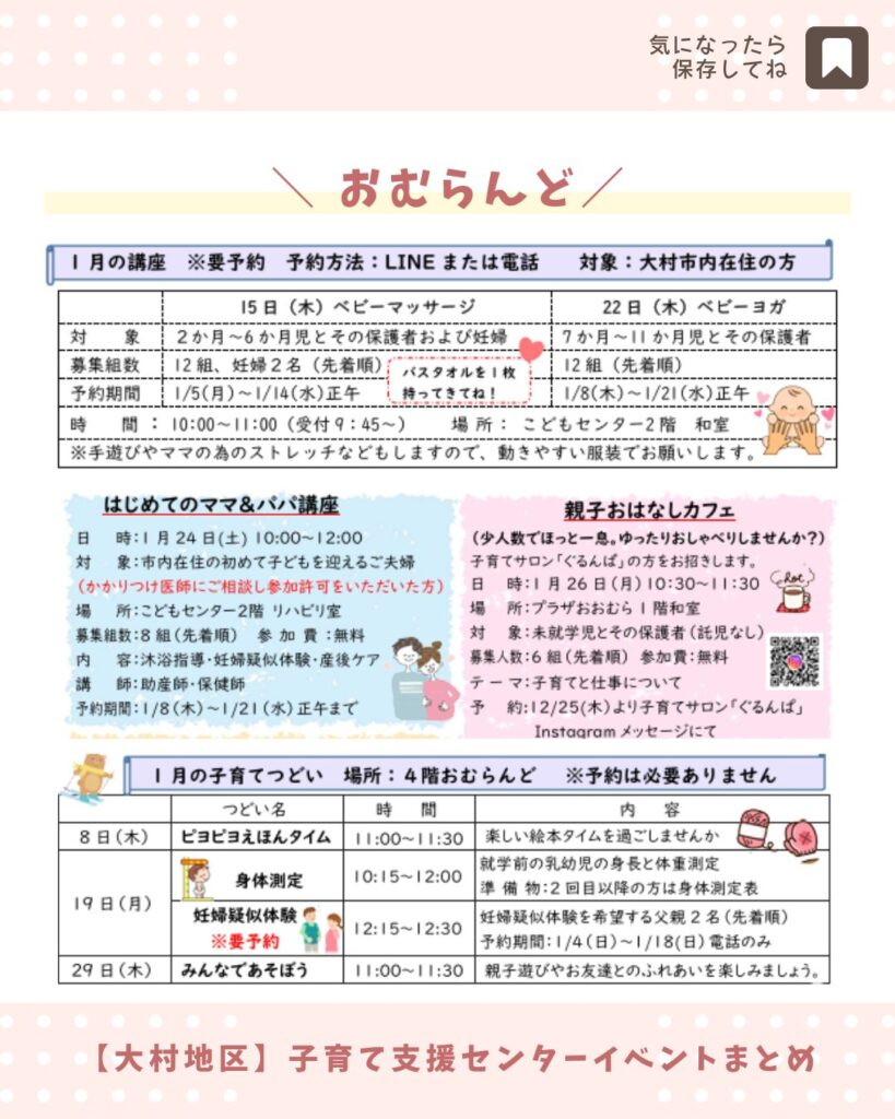 大村市の子育て支援センター全21施設の2026年1月の予定をまとめました。