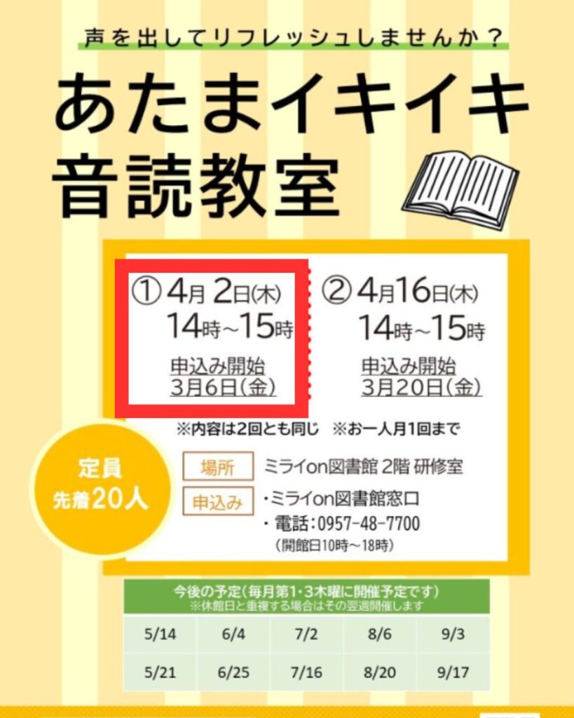 📅4/2(木)📌あたまイキイキ音読教室(ミライon図書館)