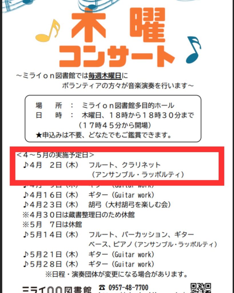 📅4/2(木)📌木曜コンサート(ミライon図書館)