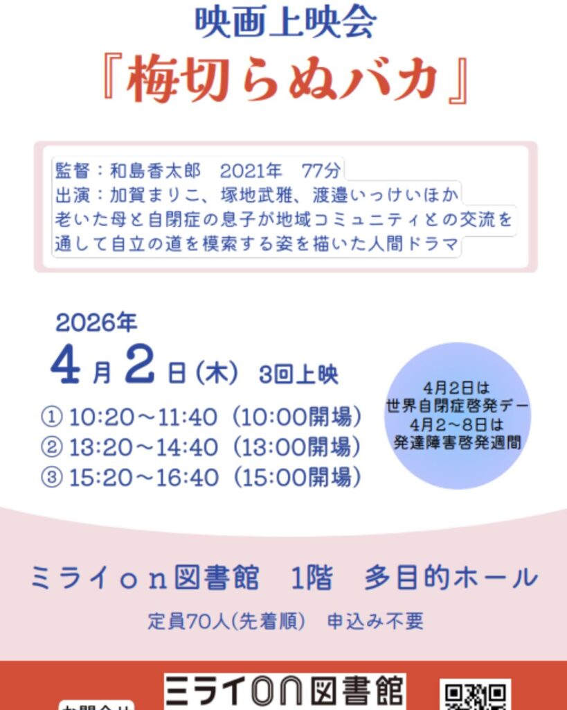 📅4/2(木)📌映画上映会「梅切らぬバカ」(ミライon図書館)